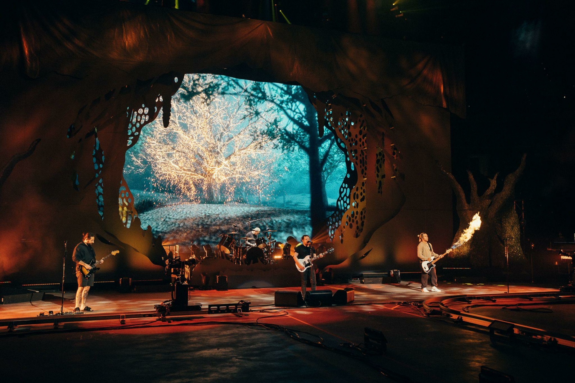 Using traditional theater techniques of layering scenic elements, we allowed Fall Out Boy to disappear behind trees and set installations and then materialize elsewhere on-stage, surprising the audience with reappearances throughout the show.