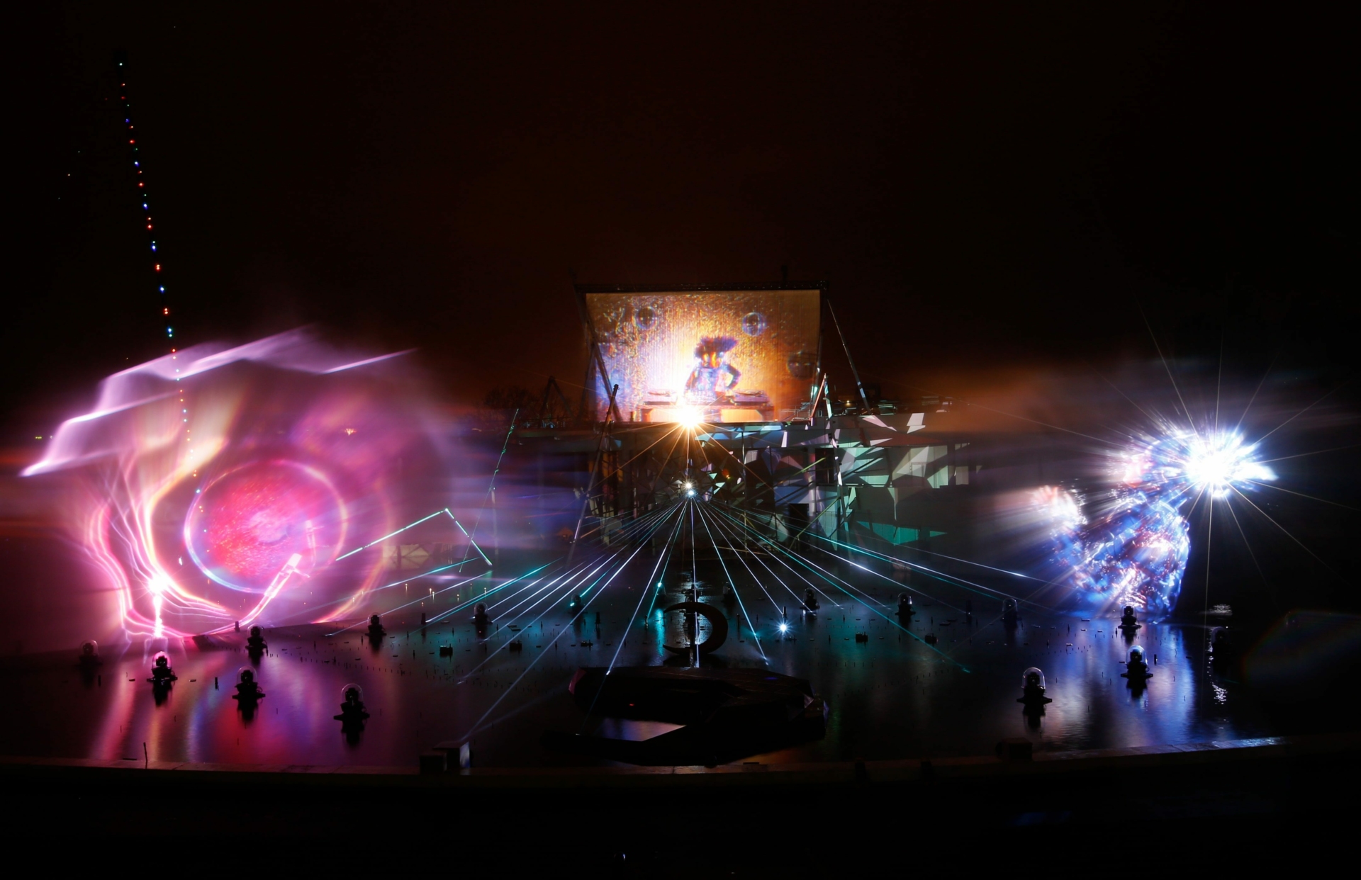 To execute this large scale show at the Futuroscope theme park in Poitiers, France, we combined hundreds of projectors, jets, fog, lasers, automated water fountains and a pyrotechnic fresco of 50 meters wide and 40 meters high perfectly synchronized with music.